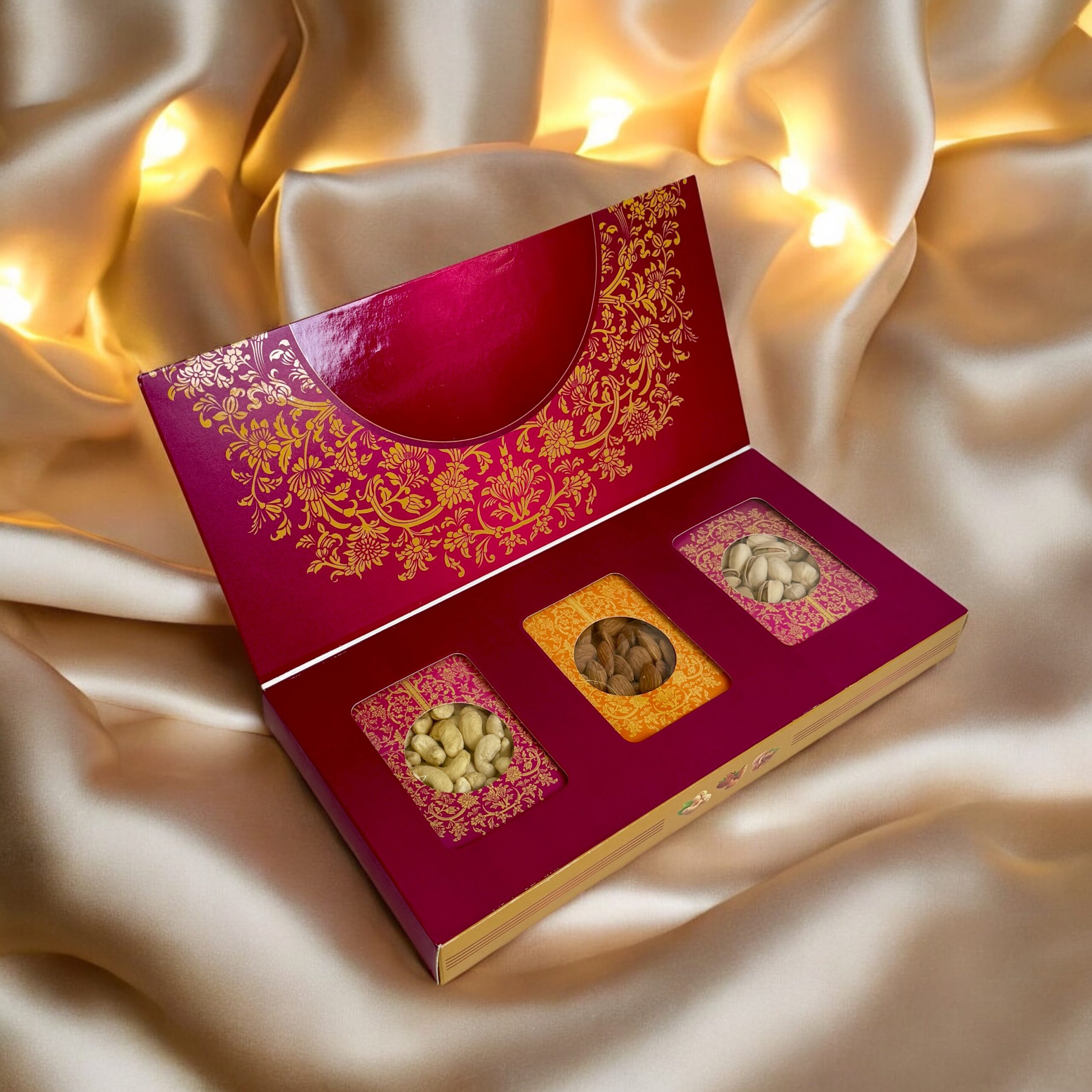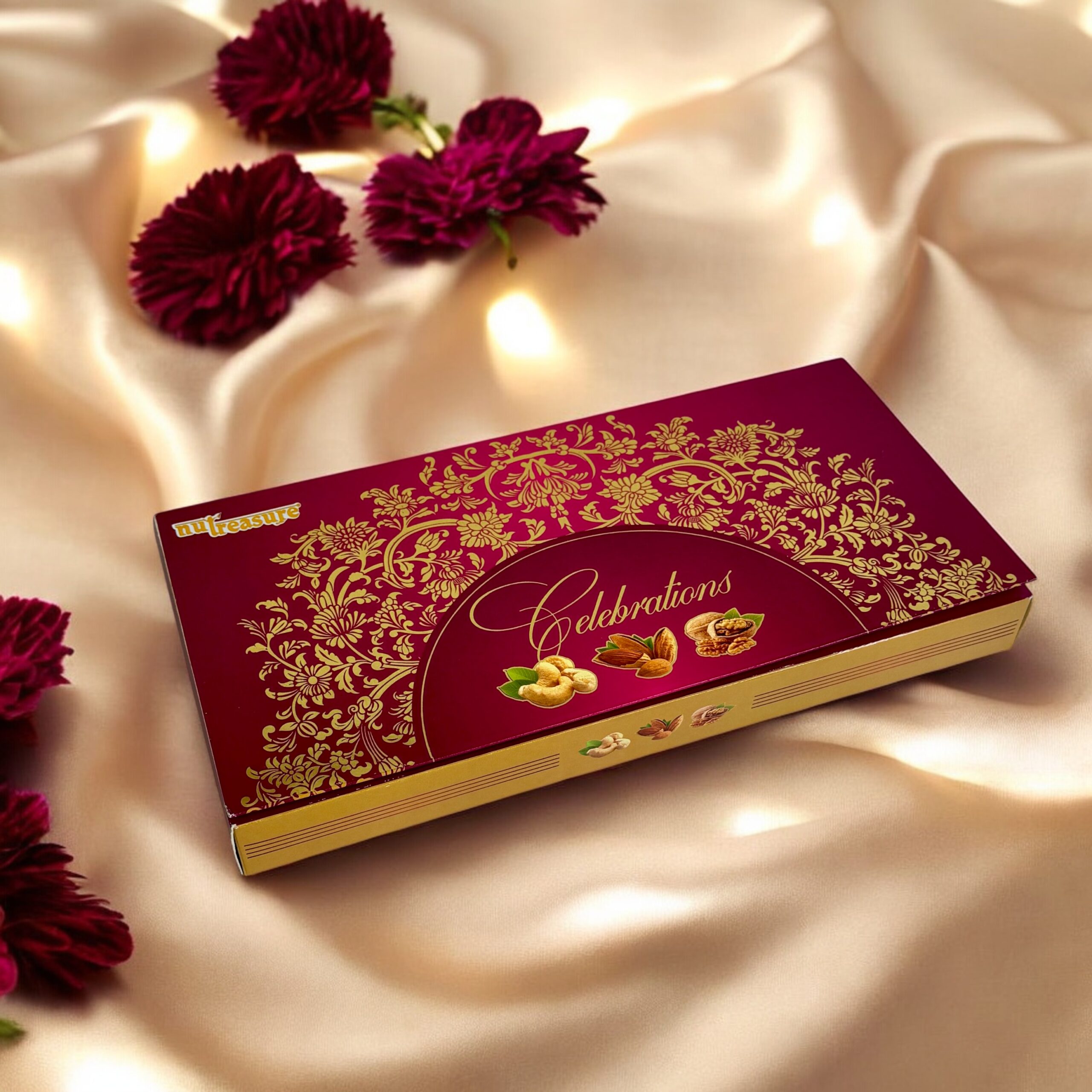Make every moment of celebration grand with Nutreasure’s 3×1 Premium Dry Fruit Gift Box. Designed in a luxurious maroon-gold “Celebrations” theme, this elegant box is perfect for festive gifting, corporate presents, or sharing joy with loved ones.